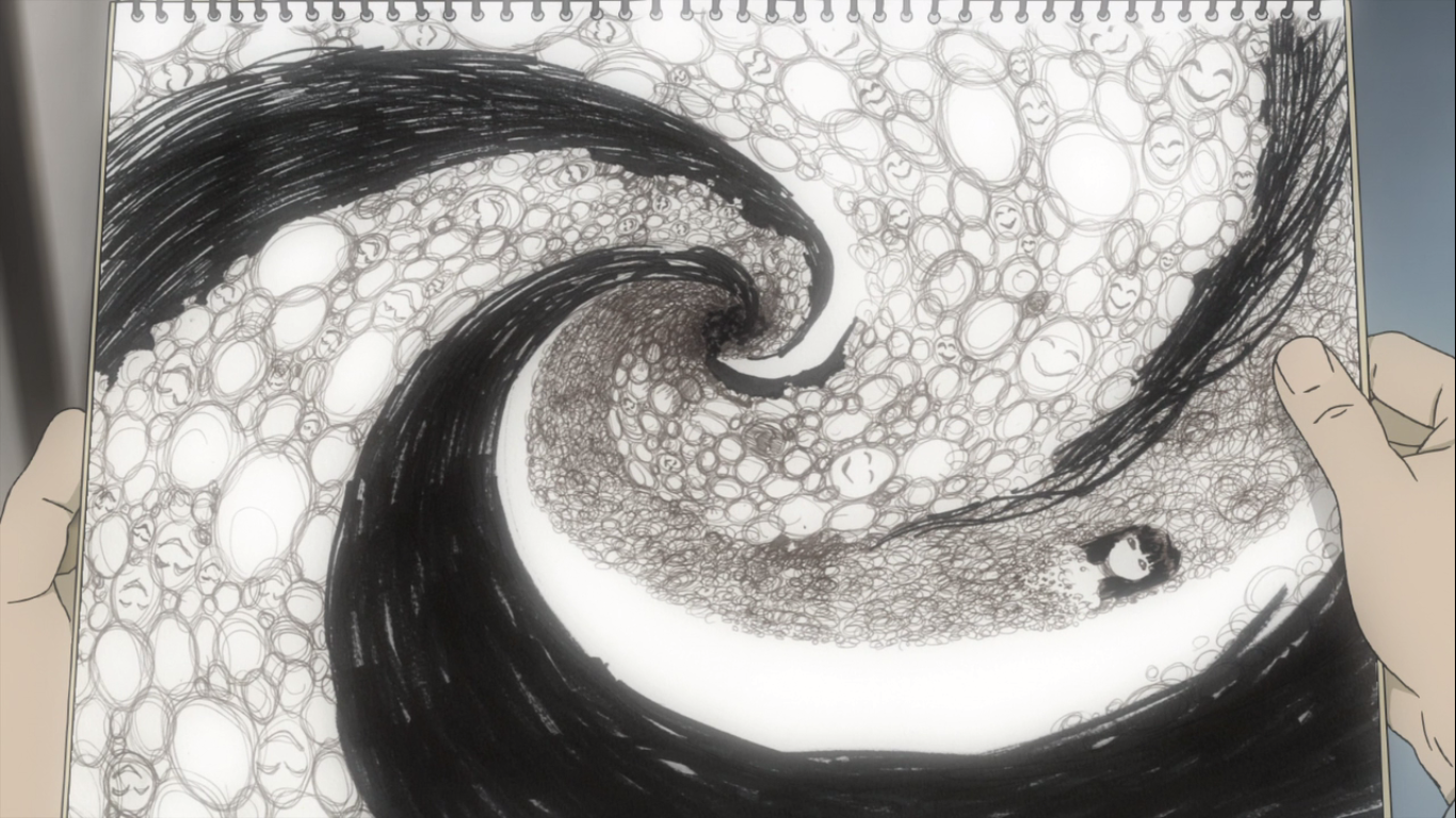 There were several cues throughout the film that hinted that Makoto might have been trying to reach out to others before his suicide attempt. He may not have confided in anyone about his feelings, but his paintings and drawings definitely paint a very telling picture of his emotional state. When flipping through his sketch book towards the end of the film, his drawings start out bright and colorful transitioning into uncolored pieces, and the final image depicts a person slowly swirling down a dark spiral. When compared with his other pieces shown throughout the film, the final drawing is a drastic shift in styles, it’s grim, but very telling.