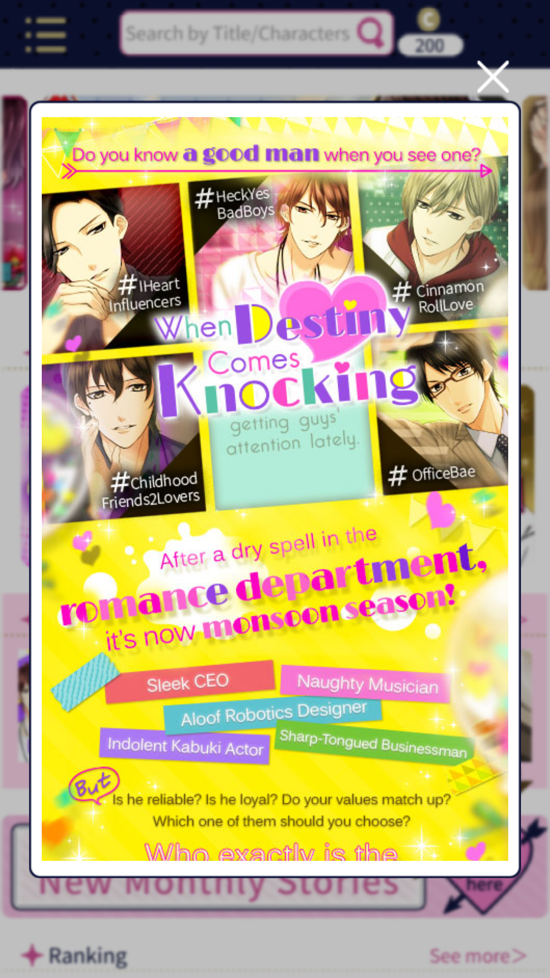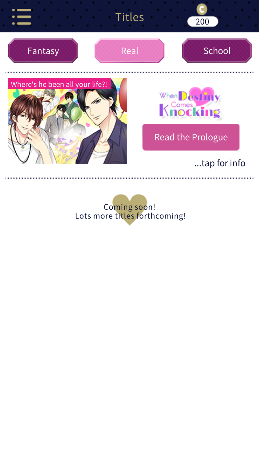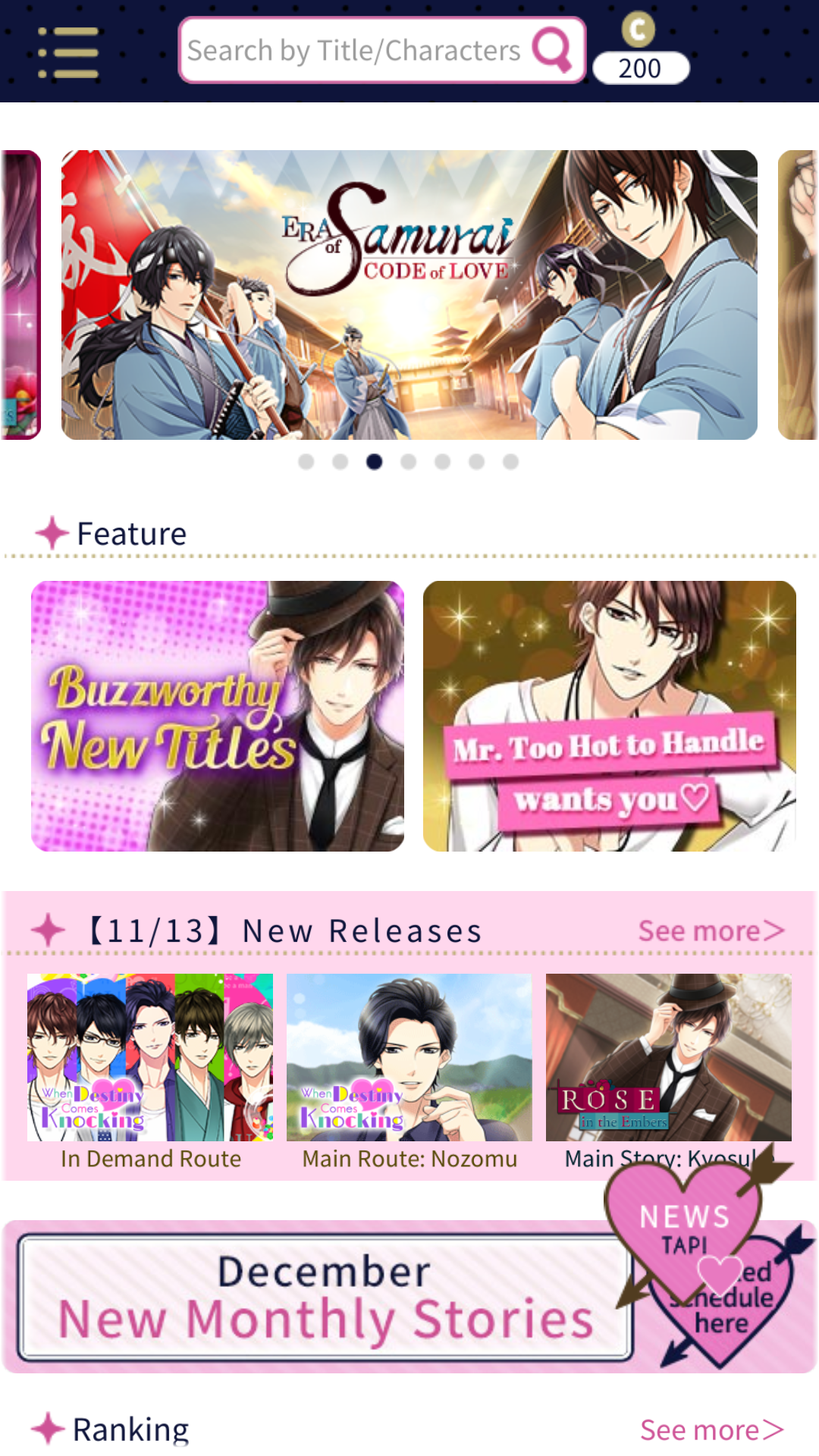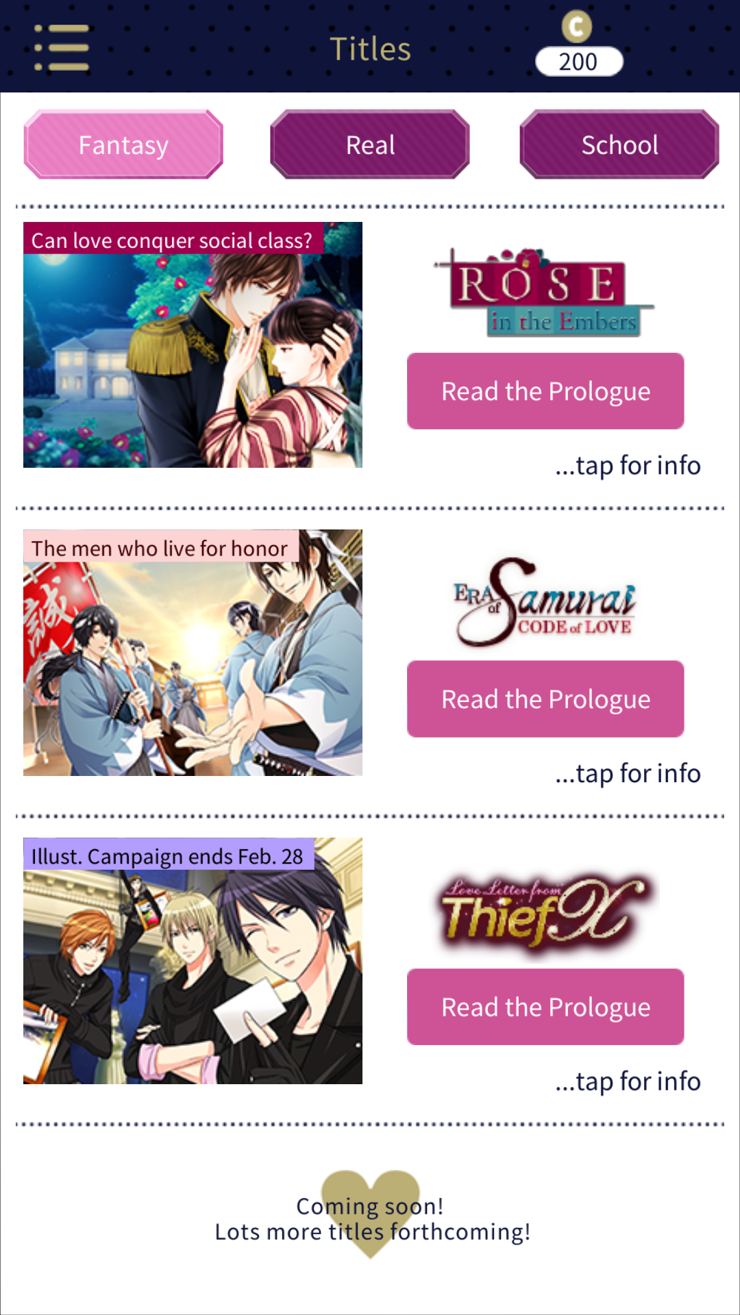 But, the biggest perk of the app is that Voltage will release all new games through Love 365, as of right now there are two brand new titles available: a historical fantasy set in the Taisho era, Rose in the Embers and a rom-com like story, When Destiny Comes Knocking.