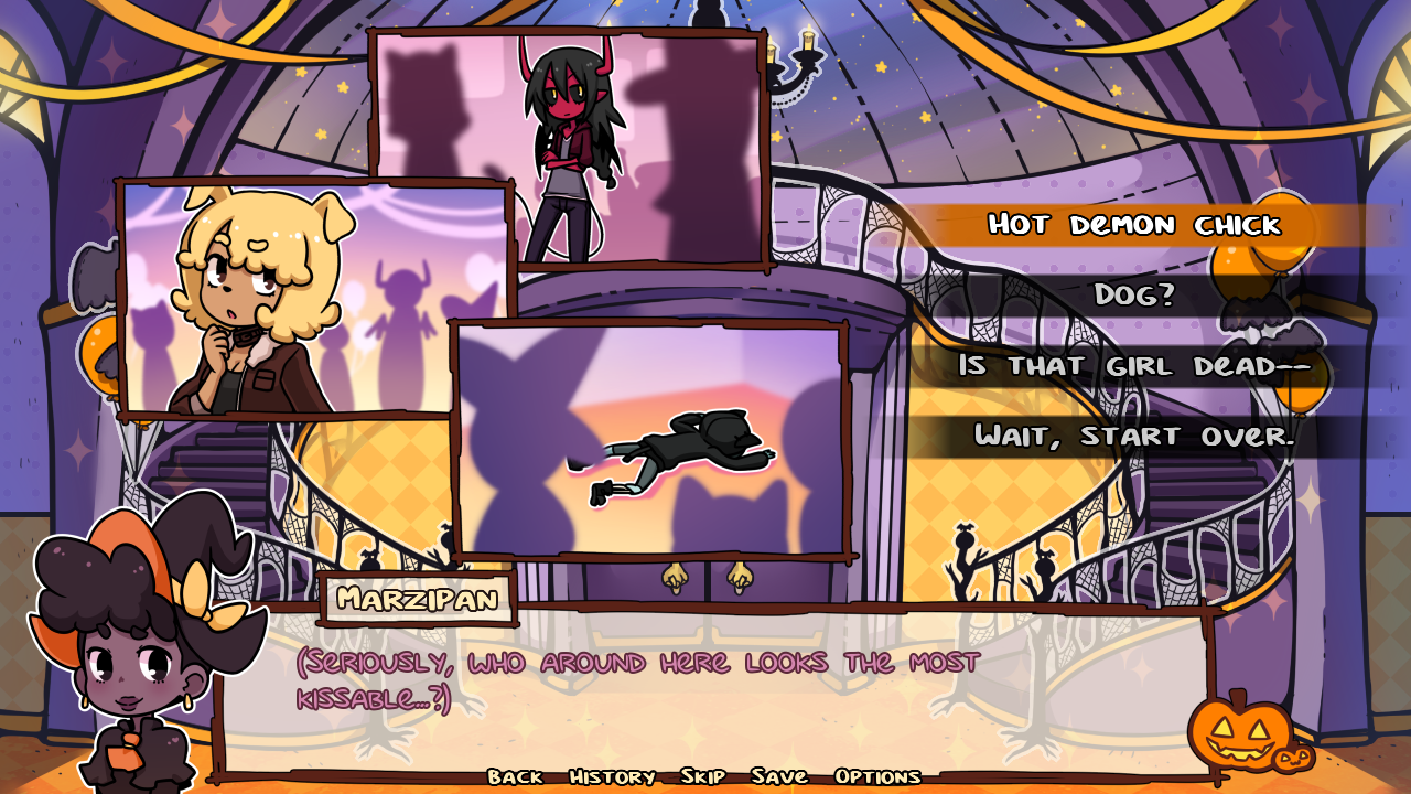 In First Kiss at a Spooky Soiree, you play as Marzipan, a witch that specializes in light magic as she attempts to find someone willing to share a kiss with her. So, she and her BFF, a catgirl named Jam hit up a nearby party in hopes of helping Marzipan lock lips with some mysterious stranger.