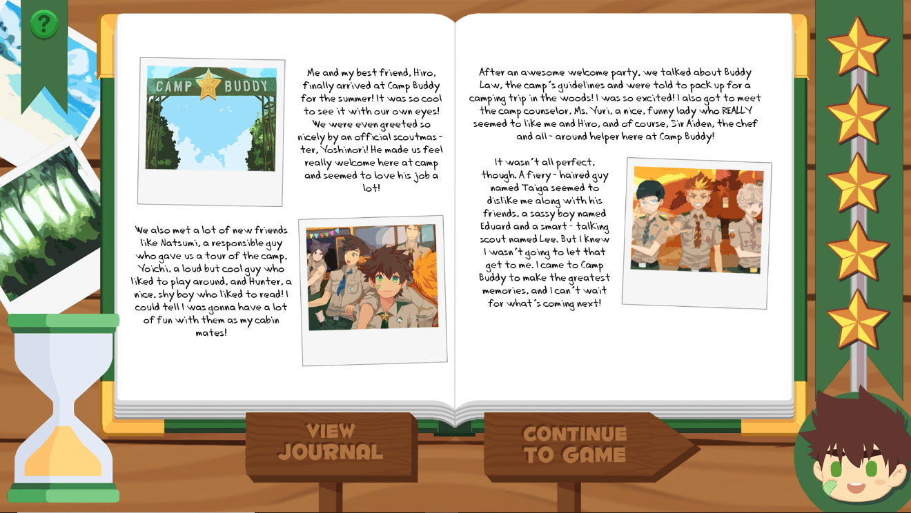 Camp Buddy follows the exploits of the ever optimistic protagonist, Keitaro Nagame as he and his childhood best friend explore the summer scout themed adventure camp aptly named, Camp Buddy. There he meets a colorful cast of characters, from eccentric scoutmasters to fellow scout mates, Keitaro is bound to make some great new friends and maybe even find love along the way. But, when the camp falls on hard times, it’s up to Keitaro to unite the campers and restore the camp’s reputation. Currently there are four pursuable love interests, with the potential for more in future updates of the game, though patrons have access to new content before the public.