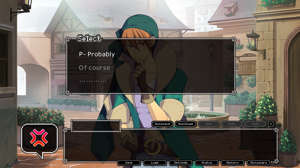 MC in this game is pretty much a throwaway character, following the silent protagonist trope to the letter, which is fitting given the fact that most RPG protagonists are “silent hero” types anyway. However, I will say that I like the creative way this was handled in the dialogue. Whenever the MC speaks, rather than actual words, her speech is depicted as a series of symbols and her in game sprites are just a series of emotion symbols that change depending on her mood. Since this is a visual novel, there are a few dialogue choices that steer the course of the dialogue, but, nothing that drastically changes the course of the story, save the endings.