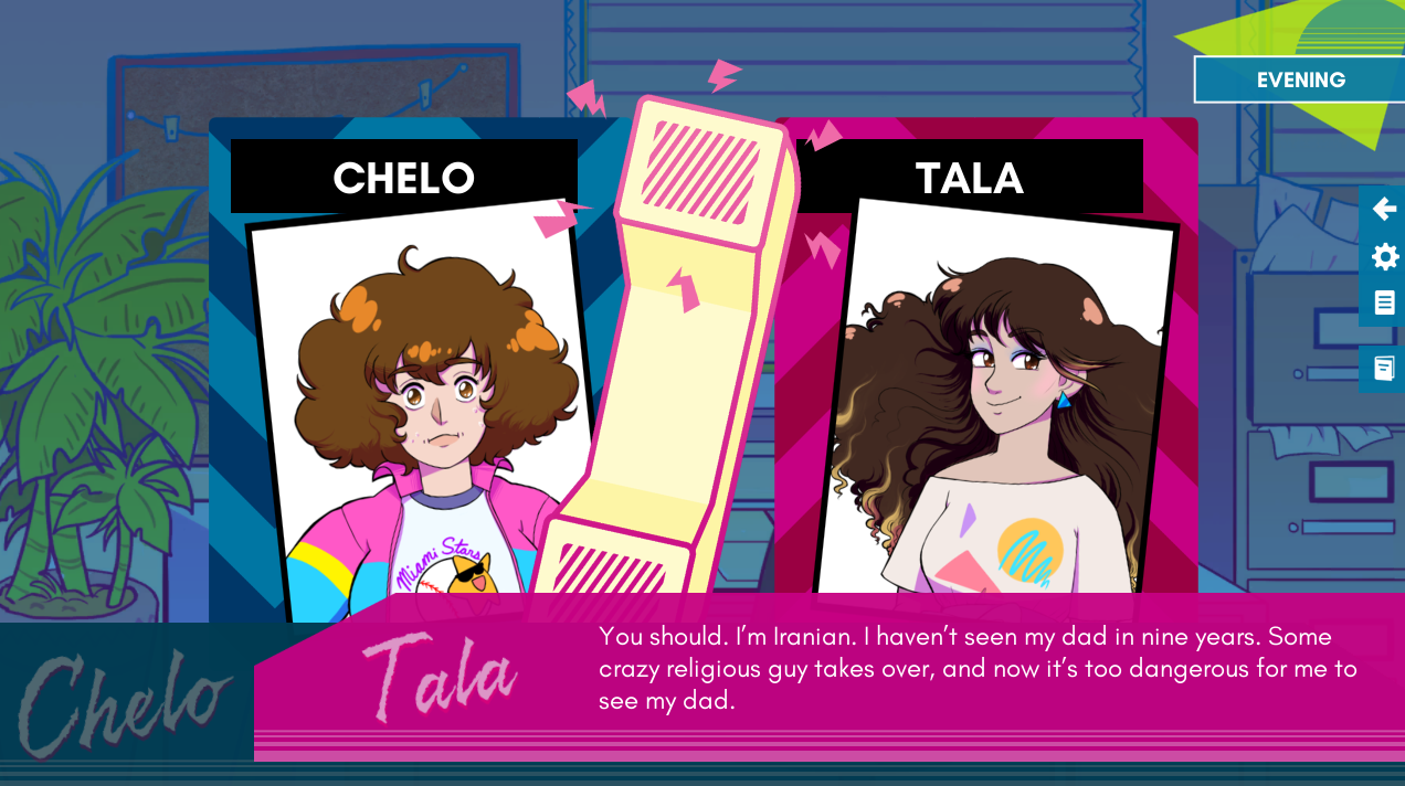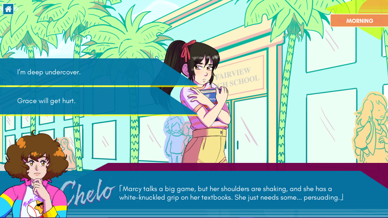 Protagonists can make or break a game, and Chelo is definitely one of Ghosts of Miami‘s strong points. Headstrong, vulnerable, flawed, and determined, Chelo is a young Cuban-American woman out to make a name for herself as a private investigator. While she isn’t perfect, her dedication to her cases and her friends is admirable. I saw a little of myself in Chelo; a young adult struggling to find their way in the world, balancing a personal life with work and family… romance. She is definitely one of the better visual novel heroines to come around in a long time.