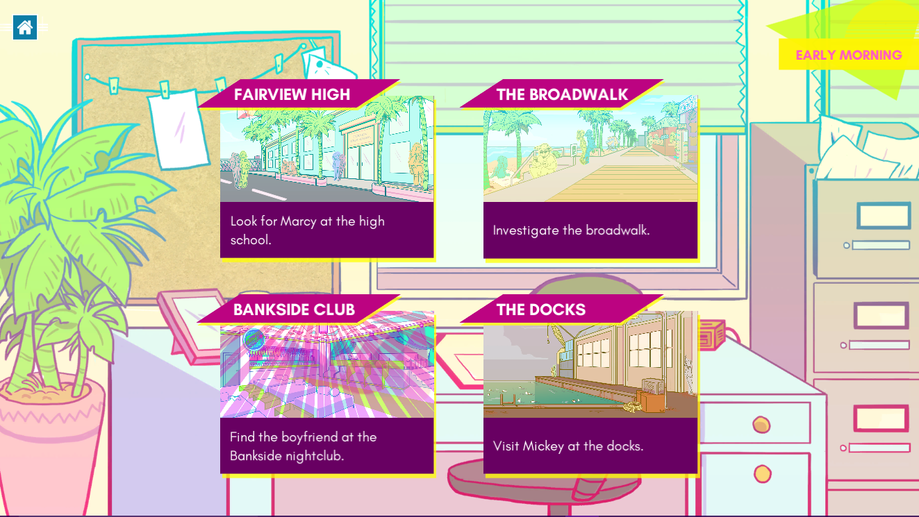 At its core, Ghosts of Miami is a detective game and it in that respect the game is fairly average, while the player can investigate cases and interrogate suspects/witnesses in each of the five cases, everything is done within the standard visual novel framework. While you can visit the various locations around Dade County, you can’t really interact with the environment, so there aren’t any crime scene investigations or prolonged clue hunting expeditions. The bulk of the investigations are conducted by interacting with the colorful cast of main and supporting characters around Miami. While this doesn’t necessarily take away from your enjoyment of the game, true fans of detective games will be left wanting since Ghosts of Miami only tackles half of the gameplay you’d expect. However, that doesn’t mean you won’t have a lot of fun solving the cases alongside Chelo, there are five missing persons cases to solve and each one is unique from the others.