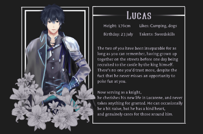Recruited as an imperial scholar serving the crown of Lucarene, you lead a peaceful life at the castle, responsible for researching, tracking, and recording everything there is to know about the royal city. Living a life you once thought you could only ever dream of, you wouldn’t change anything for the world. But as fate would have it, you’re thrown into a turmoil of events where you’re pinned as a scapegoat and forced to flee the country, running for your very life. You set off on a journey, featuring a colourful cast and new horizons.