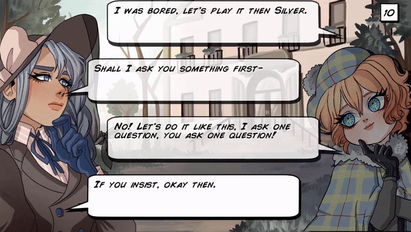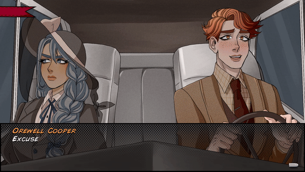 Now, the thing that really stands out about the game is its rather distinctive art style. Western visual novels are known for straying away from the more traditional anime inspired art style, but even still Misadventures of Laura Silver really does have a style all its own. There’s a very vintage feel to the designs that I really dig, especially the large expressive eyes, it really fits in with the 1930’s setting. I also want to note that the sprites are animated, there are the standard eye blinks and mouth movements, but Studio Attic Salt goes beyond that, for scenes where the characters are driving, the characters move and sway with the movements of the car (and their arms move as they steer). It really goes a long way towards bringing the characters and the world of the game to life and is a nice reprieve from the usual static images of most visual novels.