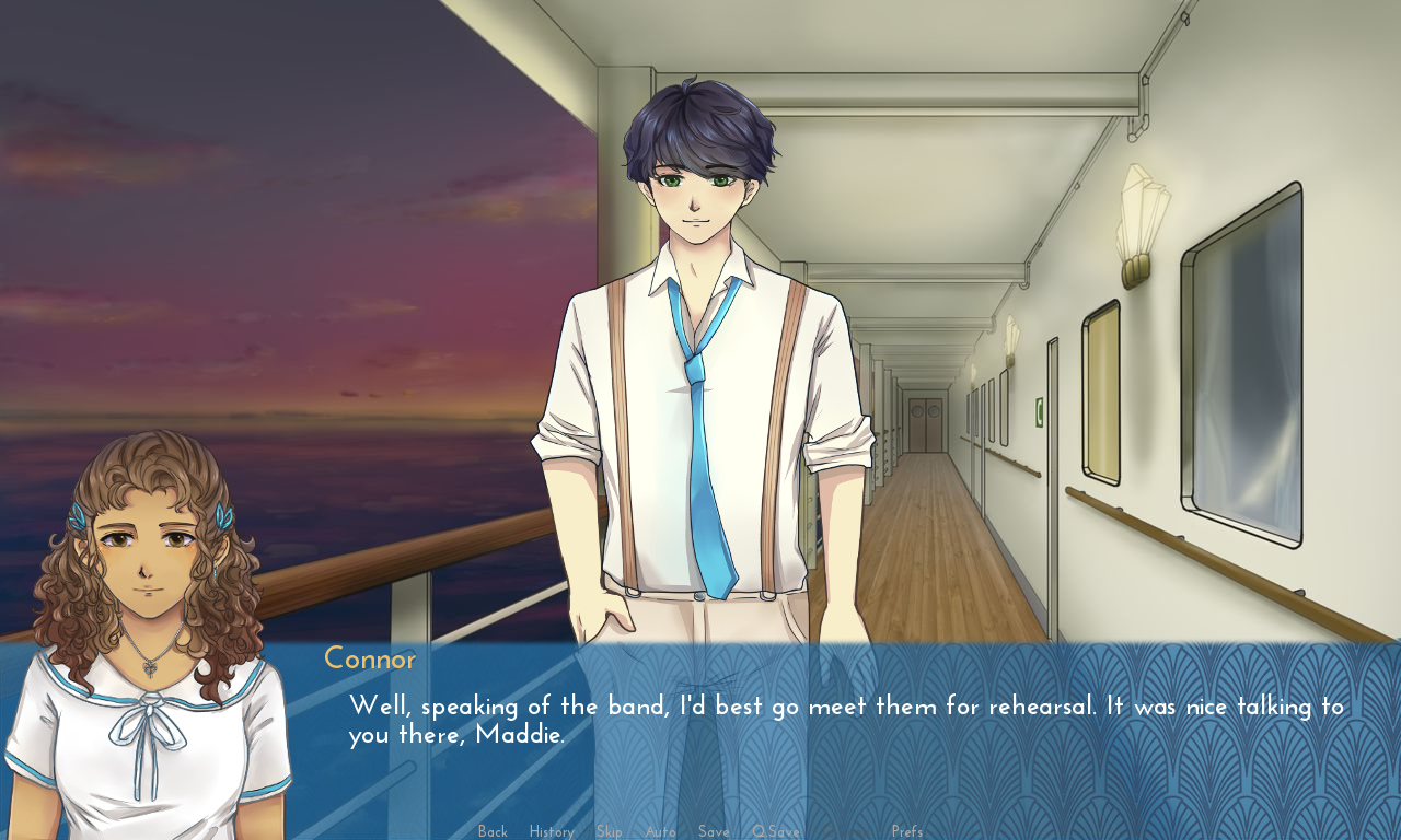 The Devil and the Deep Blue Sea is a mystery, adventure, romance visual novel with male and female love interests. The game has three romance routes (2 male, 1 female) and a total of 8 endings. The Devil and the Deep Blue Sea has the same basic gameplay as most visual novels (ie. reading and in-game choices).