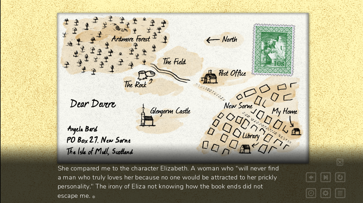 What unfolds is a beautifully written story told through their illustrated correspondences—but, what I found most enchanting was that each letter is wonderfully narrated by both Angela and Mr. Devere (voiced by Chintarmanya Vivian and Mike Young respectively). It’s a nice touch, since their voices convey their thoughts and feelings in a way just reading their letters wouldn’t and it makes the experience much more immersive than your usual kinetic novel, breathing life into the story and the characters.