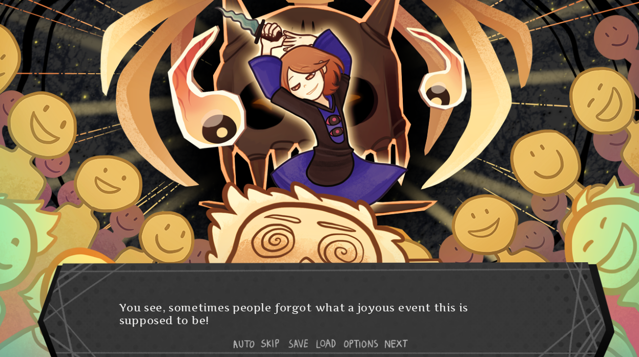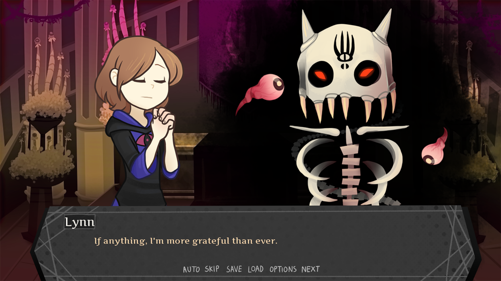 This game is hilarious!! Divilethion is supposed to take about an hour to get through, but it took me about twice as long, because I spent a good bit of my playthrough laughing. The game takes place in a nameless town under the protection of a monstrous god, Divilethion. The protagonist, Lynn is one of Divilethion’s high priests and his favorite—he is always willing to do whatever the god asks of him and he even delights in his work, much to the disgust of his younger brother Marrow. Unlike his brother, Marrow is a “heathen” who openly scoffs at Lynn and the other villagers for putting their faith in a (clearly) evil god. Divilethion’s only concern is that its precious pet, Lynn devotes all his love and affection towards it (not an unreasonable request).