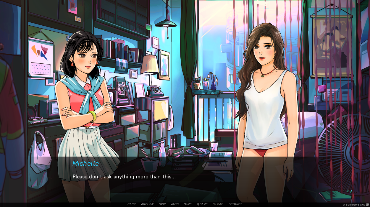 Generally speaking I’m not a fan of yuri visual novels but, I am a fan of good, emotionally engaging stories—and A Summer’s End – Hong Kong 1986 has that in spades. I was originally drawn in by the gorgeous art work and 80’s aesthetic—and God is this game beautiful to look at—but, beneath the sleek style is a emotionally engaging story that will stay with you long after finishing it. A Summer’s End – Hong Kong 1986 is a strong debut title from Oracle and Bone and I can’t wait to see what else they have in store for us in the future.