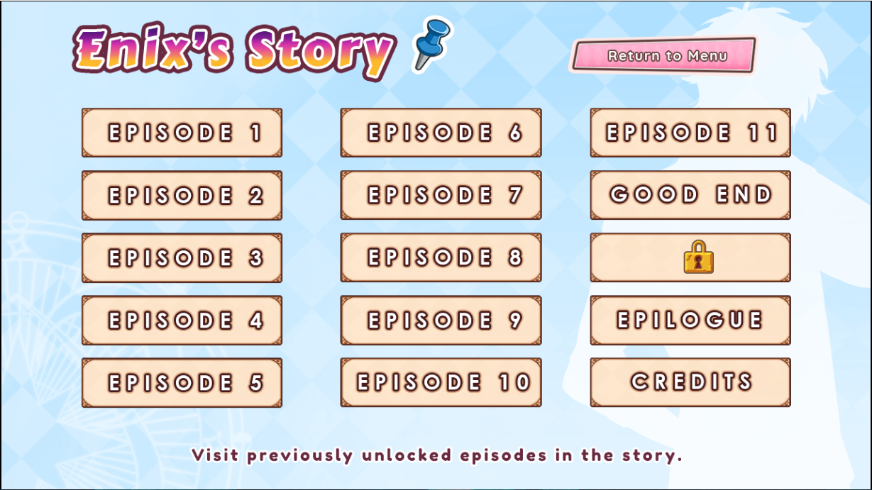 Unlike most games where you’re given a set number of save files, Love Spell uses a chapter by chapter replay feature—once unlocked you can go back and replay any chapter you want without having to fumble through save files. However, not having a quick save feature does mean that if you DON’T finish a chapter before shutting down the game, you have to replay that whole chapter over again from the beginning.