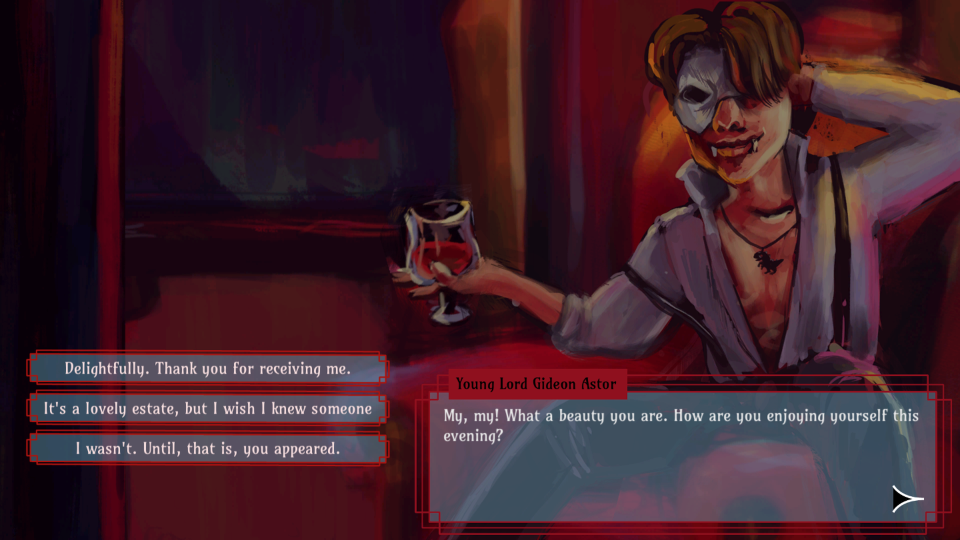 Kill Your Darlings is a short horror dating sim developed by ThetaNord and classheikki for the Spring 2019 Games Now! Jam. This is more of a slow burn gothic horror where you interact with three monstrous guests of the Unholy Mascarade: Bahiyya of the Void, Precious, and Lord Gideon Aster. Each guest is eagerly awaiting the arrival of the mysterious Baneful Valentine, a monstrous entity said to devour other monsters. But, who is the Baneful Valentine and more importantly which guest will you take home with you?