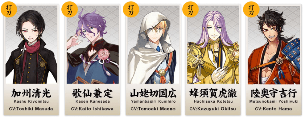Though there are many other Sword Men that players can obtain throughout the gameplay, all players begin their journey in the game with the following starter Touken Danshi: