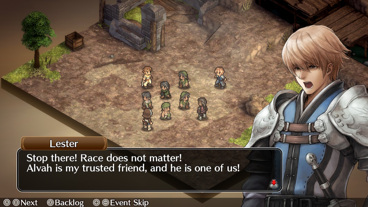 This immediately harkens back to WWII and the relocation and incarceration of Japanese Americans and more recently the Trump campaign’s forced detainment of individuals at the Mexican boarder. It’s a heavy topic for any game, but I was genuinely surprised to see something like this being tackled by an SRPG. And I’m going to be honest I was a bit squick about a group of primarily non-POC mercenaries rounding up a group of Black and brown immigrants. BUT, what was more intriguing (at least for me) is that one of the members of the Twin Dragons, Alvah is in fact Westarii. By joining the Twin Dragons he is actively working against the his own people, a point that is actually addressed in the game. There is this wonderful scene early on where some Westarii immigrants call Alvah out for siding with the enemy. His Eurosii teammate Lester comes to his aid to tell the Westarii that it isn’t about race and that Alvah is a “good person and his friend” only for Alvah to turn around and tell Lester that he has no business speaking on his behalf because he has no clue what it’s like to be Westarii in Euros.