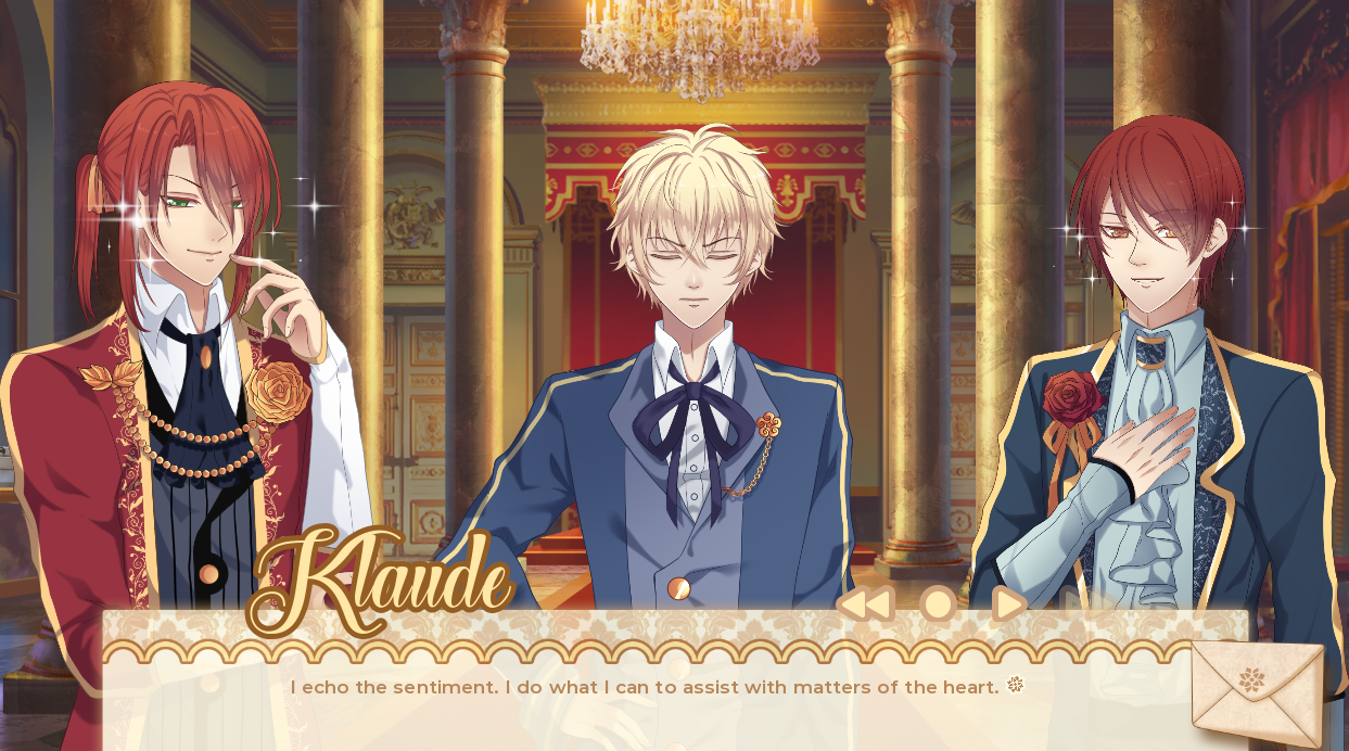 The art in the first game was really good and it is nice to see that carried over in Evermore. Kooriiko’s style lends itself well to the fairytale themes of the game and it was nice to see the return of the storybook illustrations during the game’s intro. There are some subtle differences to the character sprites between the first game and this one, which was a nice touch given the two year timeskip. The CGs are good, buuuut, there were still some that felt a bit awkward *cough* Chevalier’s last CG *cough*—that aside, Cinderella Phenomenon is definitely one of the more high end indie otome games. I also want to note the animated opening is gorgeous and the UI while not as pretty as the stained glass design of the first game is still nice. I did also like that there were cute animations for some of the sprites—like the mischievous glint to Chevalier’s glasses or Klaude’s bishie sparkles.