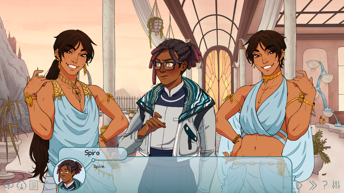 In the game you play as Spire Risan, an off-worlder scientist who becomes entangled in the drama of a mountain they came here to save. The character is a graduate student working to develop climate technology and find themselves way over their head as they attempt to make large scale environmental change. Spire identifies as non binary, which sets The Sky Left Us apart from other visual novels that tend to lean towards either male or female protagonists. In the game, Spire falls in with the denizens of the three castes, and finds that things are more complicated than they seem: be it love, family, or the systems that shape us.