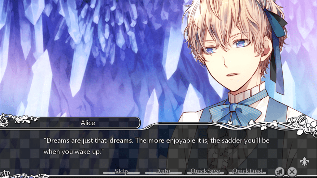 Snow White is one of the love interests that you don’t get to spend much time with in the other episodes. He’s cute, but ultimately pretty distant whenever he shows up in the story, so I really didn’t know what to expect from him in his own route. A cool and composed young man, with ethereal beauty, Snow White is the epitome of a fairytale prince, but his aloof demeanor and blunt words leave much to be desired, which of course does nothing to dissuade Yurika. Snow can be a bit cold, the boy has NO filter, but he is never malicious, just brutally honest. I really liked the relationship between Yurika and Snow, it was cute to see him rebuff her advances only for her to comeback full force. I love characters that play hard to get, because it makes it so much more rewarding when you finally get them to open up, and when Snow smiles, it’s like a rare treat~ He is a lover of books, especially fairytales which he uses to escape the hardships of life… in a way that hits a little to close to home…