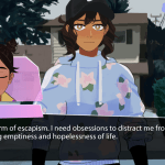 Butterfly Soup is a short, sweet coming of age story about four LGBTQ Asian-American teens, as they navigate the ups and downs of high school and friendship. The game offers an interesting look at the lives of all four of the girls, and their relationships with one another, particularly the budding romance between Diya and Min-Seo as they come to terms with their budding feelings for one another. While the game does address the complex nature of their relationship, the game is relatively lighthearted, and hopeful.