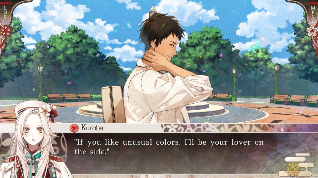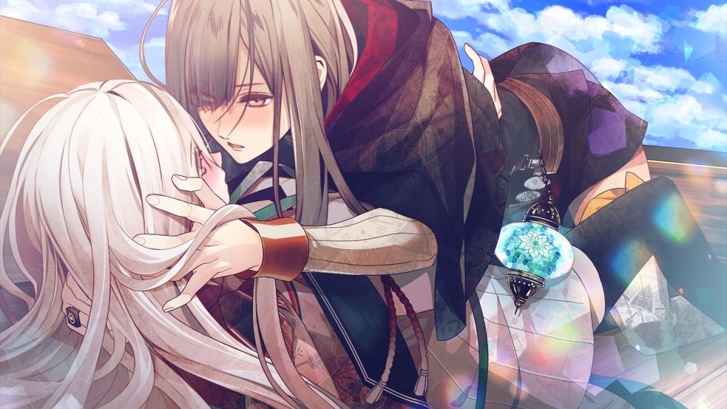 The characters are all great and for once I can honestly say that I enjoyed all of the love interests and their routes–Kuroba and Yosuga being my favorites. Olympia is a fantastic heroine, she has a strong sense of justice and I love that she is not above taking charge an calling the LIs out on their BS. I think she was at her best in Akaza and Riku’s routes since that is where she really gets feisty with them and we stan a strong heroine here! One thing I didn’t like was how often Olympia wound up in “damsel in distress” situations (read: non-con), but those are mostly reserved for the bad route endings. The LIs are all pretty good and I liked their portrayal throughout, though I think Himuka didn’t give me “love interest vibes”, he felt more like an elevated extra and while he’s sweet I liked him better when he was in a more supporting role. On the flip side the side characters were a bit of a mixed bag. One of the side characters Kaina, I loved and desperately wanted him to be a love interest, because he’s just so sweet and funny (and the leader of the Red, Jigen had some serious daddy vibes) and Camelia is a rare example of a supportive otome bestie. But, then you have characters like Kanan and Nagusa who are the absolute worst–I wanted to punt the two of them into the sun–they’re the main cause of most of the bad endings in this game.