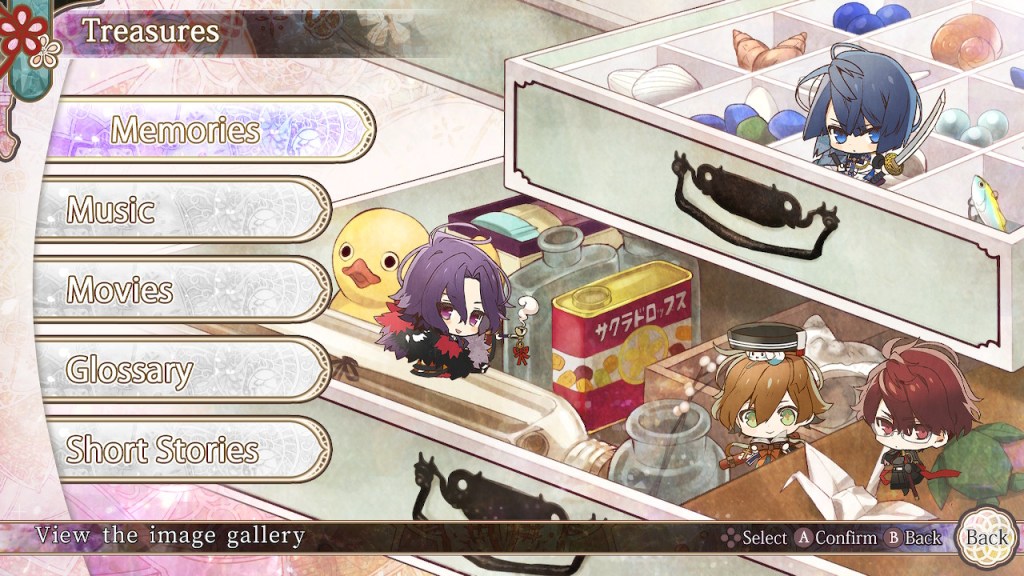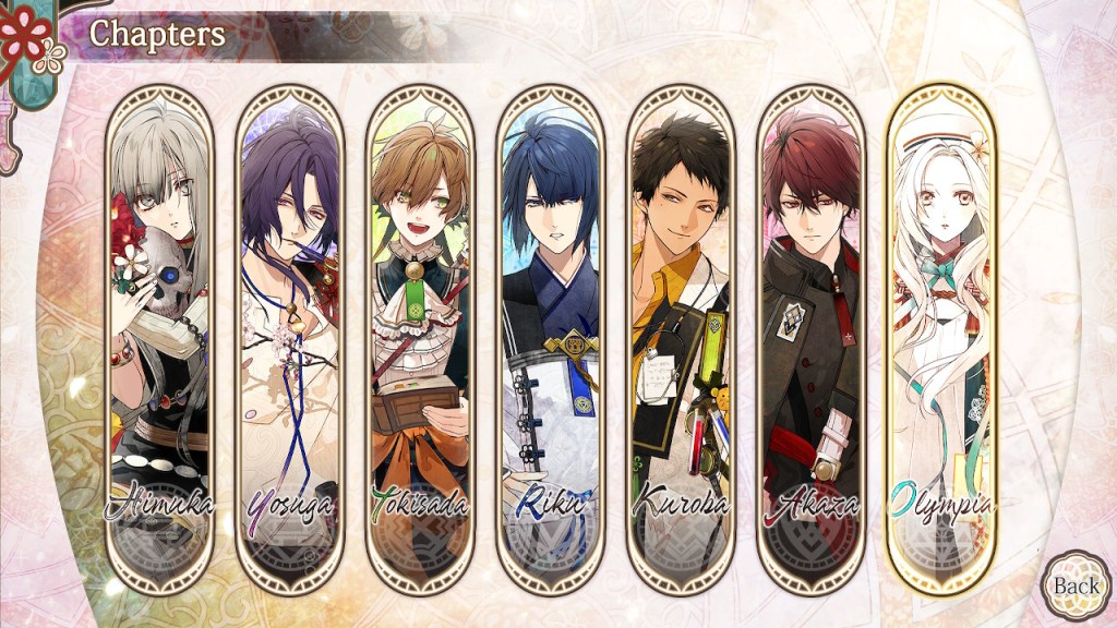 Olympia Soiree has 30 side stories that expand on the main story and characters giving more depth to the world of the game. Each LI has an epilogue that continues the romance between Byakuya and her chosen husband after the events of the main story–from intimate moments in bed to a sweet dates, each one is super cute (and a little steamy). There are also character introductions, that are set up like mini interviews that give more insight into the LIs likes and dislikes, and some of them were downright hilarious (especially when the LIs talk about their favorite part of their partner’s body). Lastly are the Memoirs, which are written accounts of the lives of key characters (main and supporting) that give insight to their motivations throughout the story and in some cases offer explanations for things not addressed in the main story.
