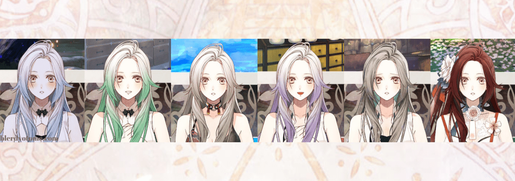 Byakuya is a nice well balanced otome heroine, she pretty outspoken when it comes to her beliefs and she isn’t afraid to go against the status quo. Because she was raised isolated from the others on Tenguu she doesn’t hold the same biases about color class and genuinely wants to make change on the island. She is a bit naive, but she is actively engaged in improving herself and learning more about the world around her. She starts up a mail delivery service to help bridge the gap between people living on the surface and in Yomi. Byakuya isn’t afraid to tell it like it is and there were more than a few times when she sets the LIs straight when they start talking out their ass (she’s especially feisty in Akaza and Kuroba’s routes). And when it comes down to getting physical with the LIs, Byakuya is all for getting frisky! Finally an MC that isn’t afraid of sex! I’ve said this before and I’ll say it again, women get horny to y’all! Also, when Byakuya gets close with her chosen boy, her hair changes to match theirs.