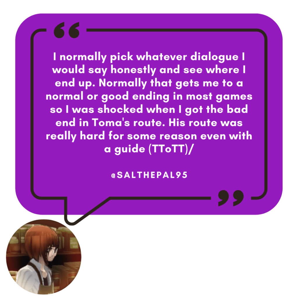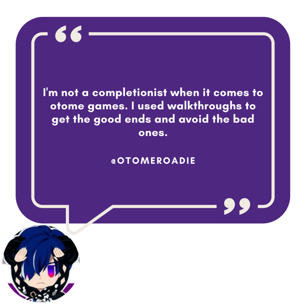 Honestly, it’s all a matter of preference! Otome fans go into their game playthroughs with a number of factors in mind–whether that’s looking for their happily ever after with their chosen boy, enjoying the sweet suffering that is Bad Endings, or crafting a comprehensive viewing experience on stream. We’re all different and it was fun seeing how other otome fans tackle otome games!