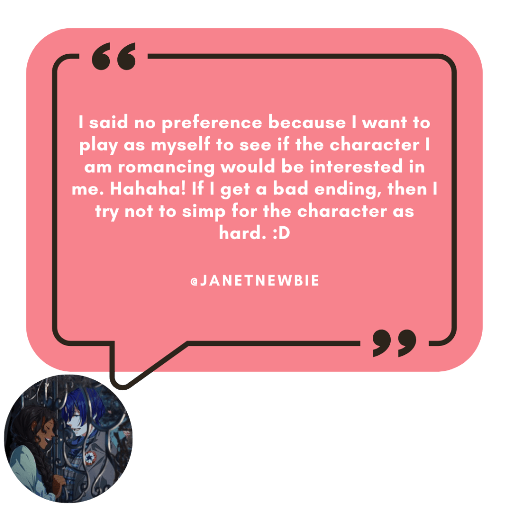 While there are those out there who go in with a plan and tailor their otome journey based on whether or not they like the love interest they’re currently pursuing. This is something I hadn’t really considered when I posed the question, but I can definitely see how someone’s feelings towards a particular love interest can affect their playthrough.