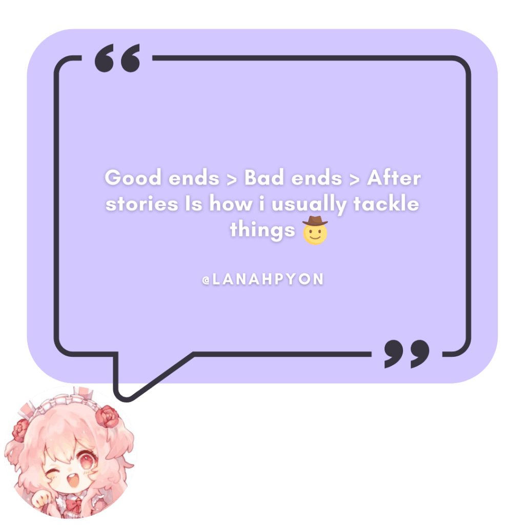 Then there were the folks that go for a more balanced approach when playing otome games–a fair amount of players like to sandwich the Bad Ends in between the Good and Normal Ends. That’s a valid approach, especially if you’re a streamer who likes to end your game playthroughs on a high note for the sake of audience enjoyment. Others simply like to balance out the good and the bad story elements for a more comprehensive gaming experience.