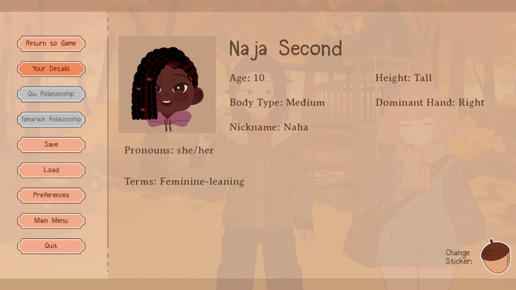 In Our Life: Now and Forever you have the option to befriend/romance two characters: Tamarack (female – she/her) and Qiu (gender fluid – they/he). Just like Cove and the MC’s relationship in Beginnings and Always, Tamarack and Qiu’s dynamics with you will develop in a custom way over the years based on their experiences with you! You can decide for yourself how quickly or slowly your relationships develop–from love at first sight to slow burn romance or you can choose to keep things platonic and just remain friends or something different.