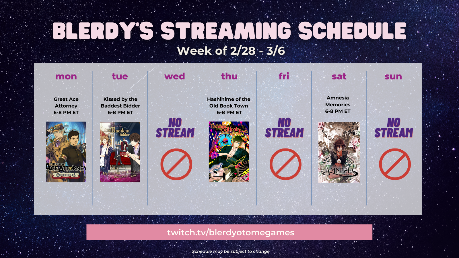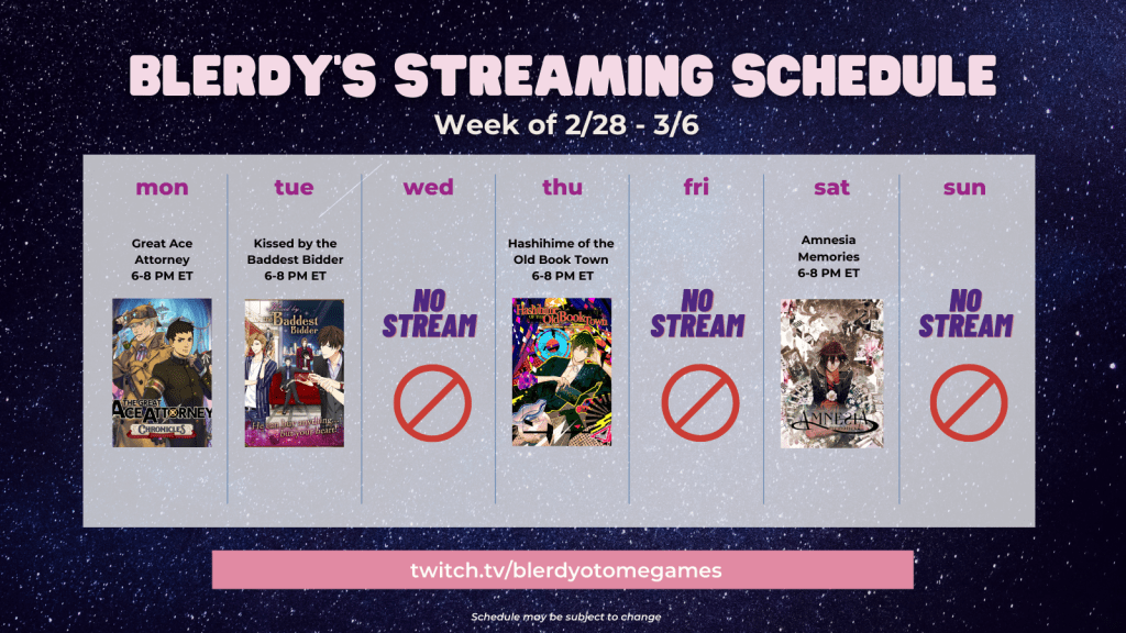 Hey Blerdy Tribe! Last year in May I started a Twitch channel where I play otome games and visual novels: twitch.tv/blerdyotomegames. If you haven’t already popped in for a stream, definitely come through, we have a lot of fun! Here is this week’s streaming so you don’t miss out: