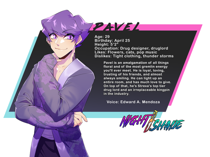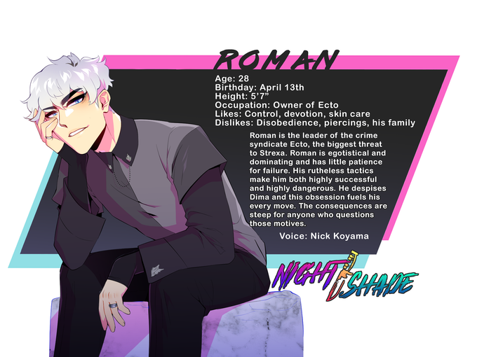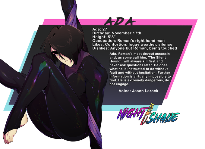 NIGHT/SHADE, is a story about facing and overcoming the toxicity within interpersonal relationships as well as within oneself. This character driven plot explores the complexities of love and loss in the form of a romantic thriller. With the colorful aesthetic of synth-wave and the nightlife of a near futuristic city, NIGHT/SHADE will take you on a turbulent, passionate experience unlike any other.