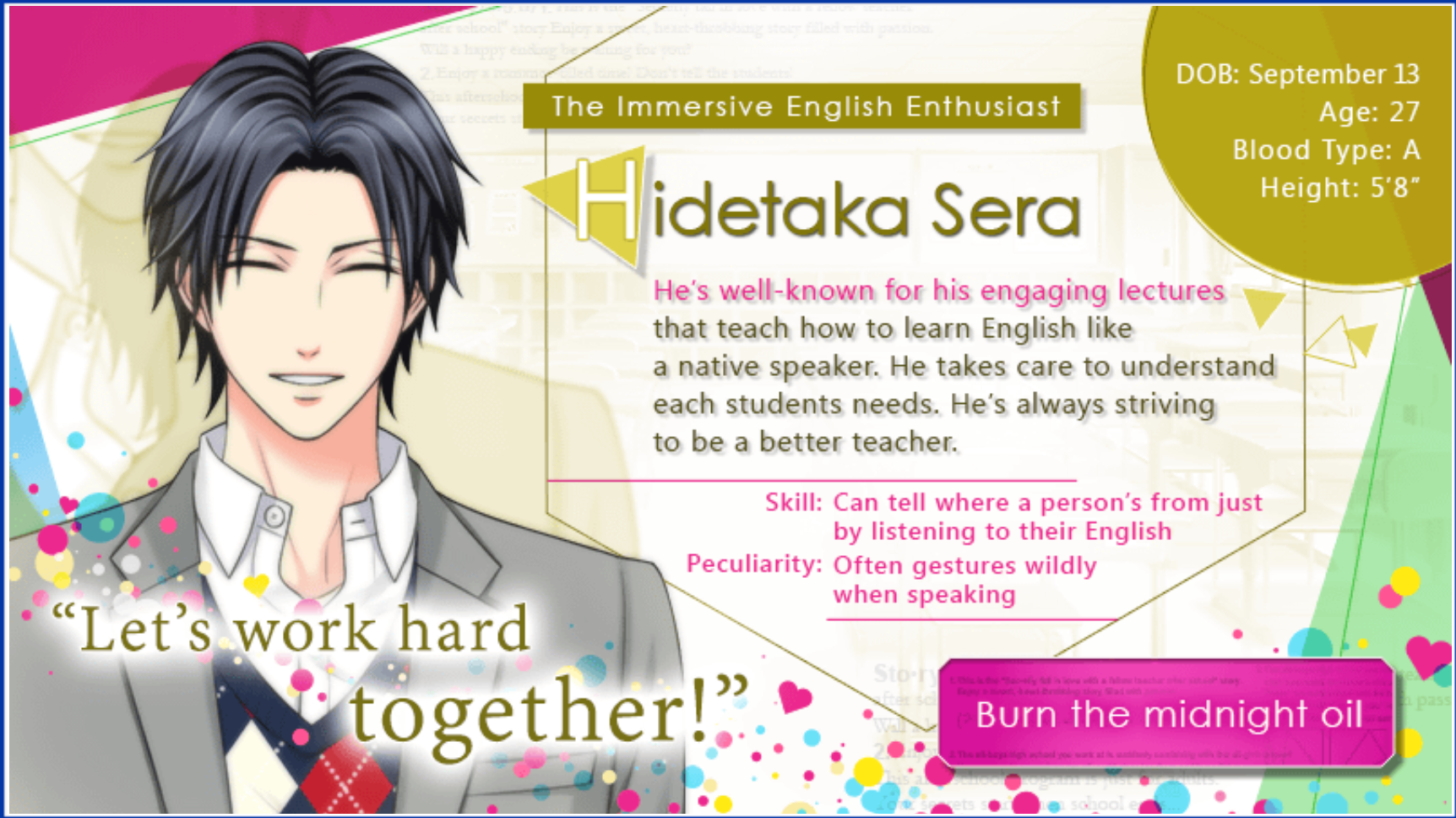 But, after that…Mr. Sera’s route took an unexpected turn and I loved it! The plot twist was “unexpected”, but welcome! Hidetaka is downright princely, with a winning smile and dashing good looks. On top of that he’s a dedicated English teacher and a famous translator too, but one can’t help but wonder if there is something sinister behind that sweet smile of his…